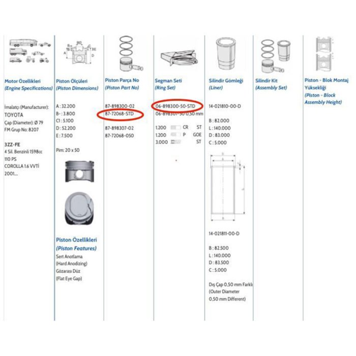 Goetze 87-72068-STD Piston & Segman Takım Toyota Corolla 1.6L VVT-I 2002-2007